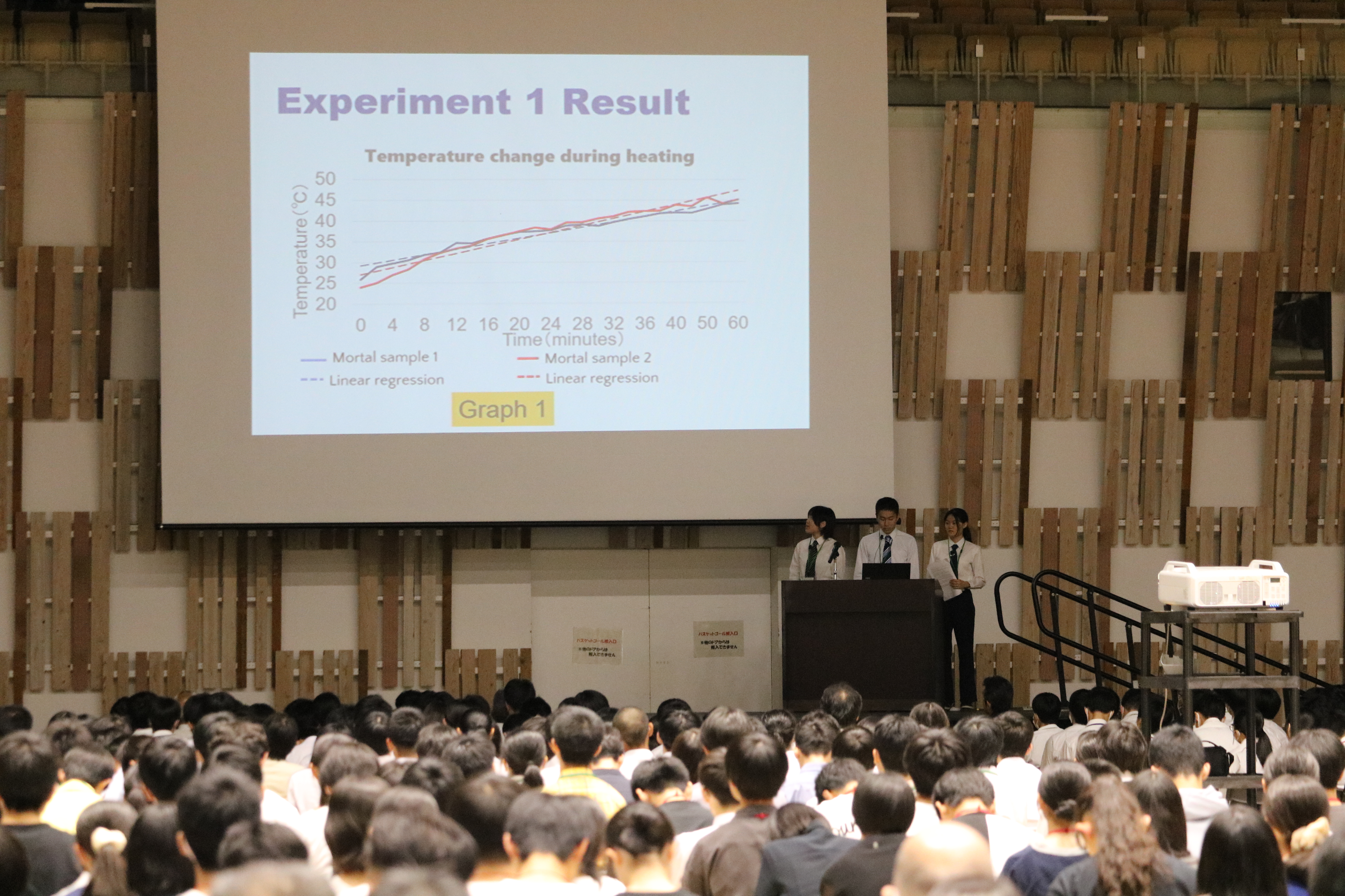 英語で発表するグループもいます。 研究の成果は、論⽂にまとめ、科学コンテストに応募します。